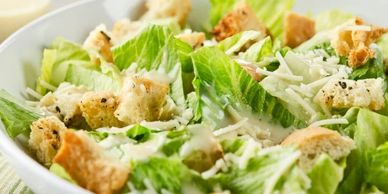 Crisp romaine lettuce tossed in a creamy Caesar dressing topped with croutons and Parmesan.
