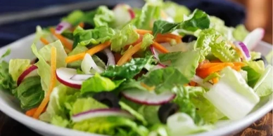 Chopped romaine lettuce, olives, cherry tomatoes, cucumber, red onion, and Italian dressing.